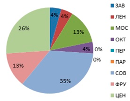 Концентрация торговых центров формата "fashion" с торговой площадью не менее 5 000 м2 в разрезе районов города, 2014 год.
