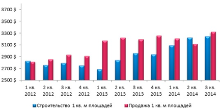 Средние цены предложения в сегментах купли-продажи и строительства 1 кв.м торговых площадей за период 1 квартал 2012 – 3 квартал 2014 гг.