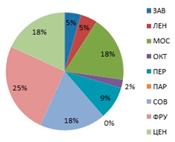 Концентрация торговых центров формата "fashion" с торговой площадью не менее 5 000 м2 в разрезе районов города, 2015 год.
