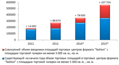 На диаграмме отражена динамика объемов площадей торговых центров формата "fashion" с площадью торговой галереи не менее 5 000 м2: