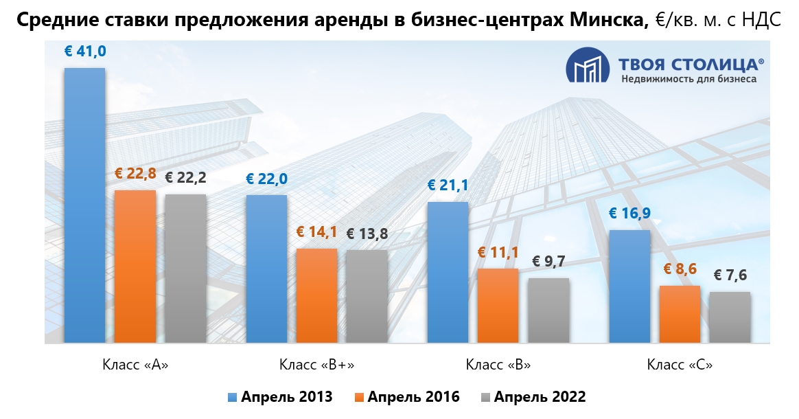 В последующие годы, вплоть до 2020 года ставки аренды постепенно увеличивались, но так и не смогли достигнуть пиковых значений 2013 года, что было прогнозируемо. А по итогам марта 2022 года рекорд был обновлен — по всем классам качества ставки аренды опустились ниже минимального порога 2016 года. И, судя по итогам апреля 2022 года, не собираются останавливаться в своем движении вниз.