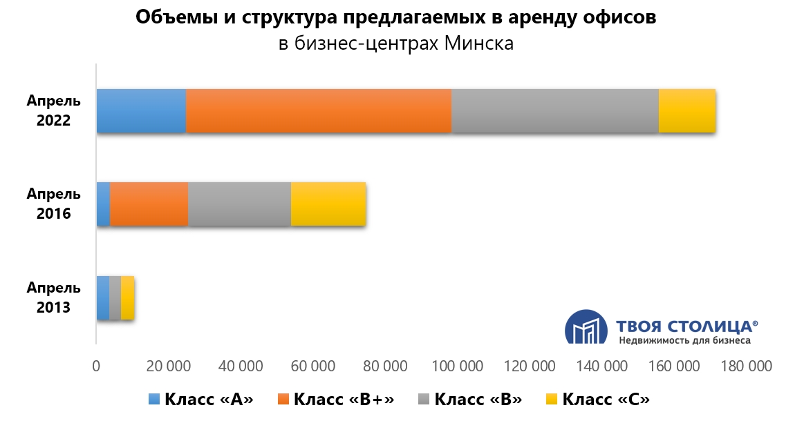 На отсутствие положительных изменений и вероятности изменения расстановки сил на рынке офисов до конца текущего года, указывает и продолжающаяся увеличиваться вакантность, поставившая по итогам апреля 2022 года антирекорд — 171 тыс. кв. м. предлагаемых в аренду офисов. За февраль-апрель текущего года этот показатель вырос на 40 тыс. кв. м., из которых больше половины (26 тыс. кв. м.) появились в предложении в апреле.
