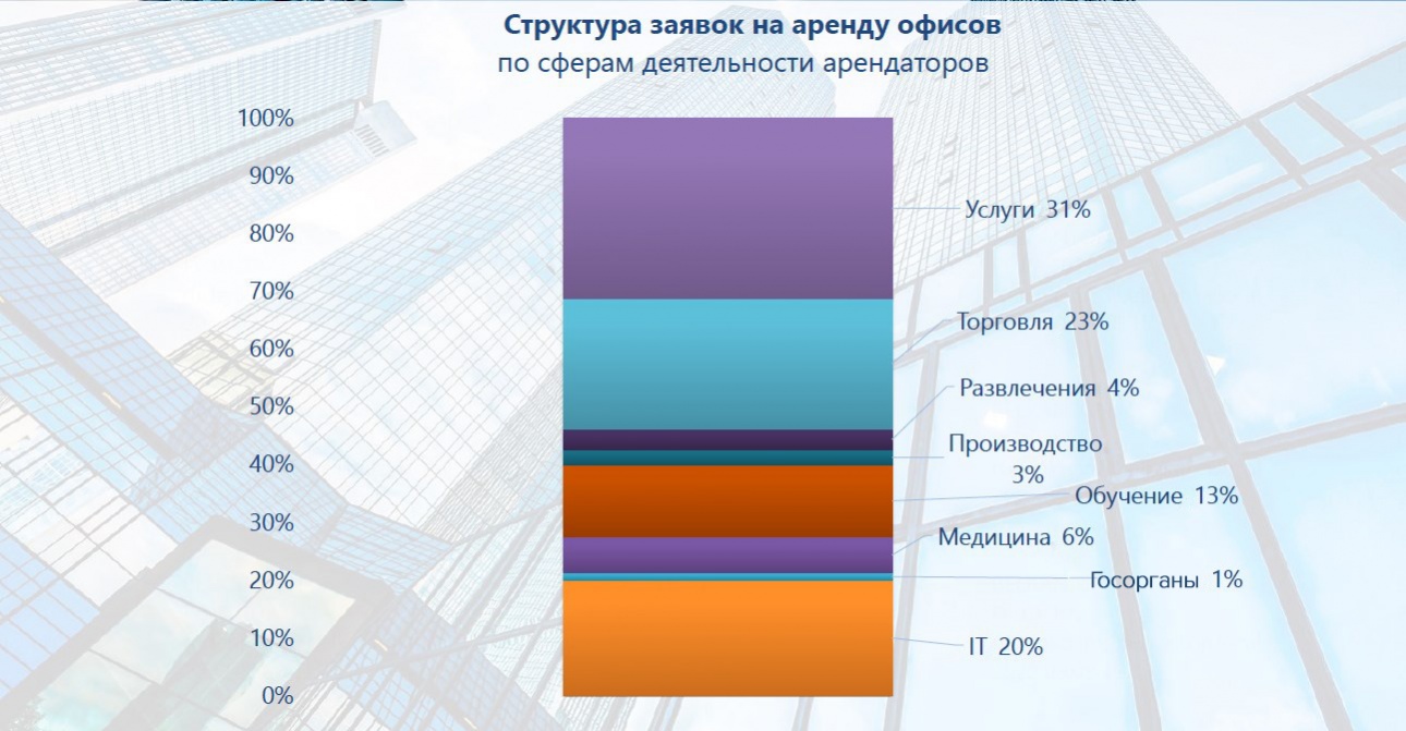 Айтишники, кстати, до сих пор входят в топ-3 арендаторов, но у них очень изменились предпочтения по площадям: если раньше IT-компаниям нужны были офисы площадью 700+ кв. м, то сейчас — 300+ кв. м.