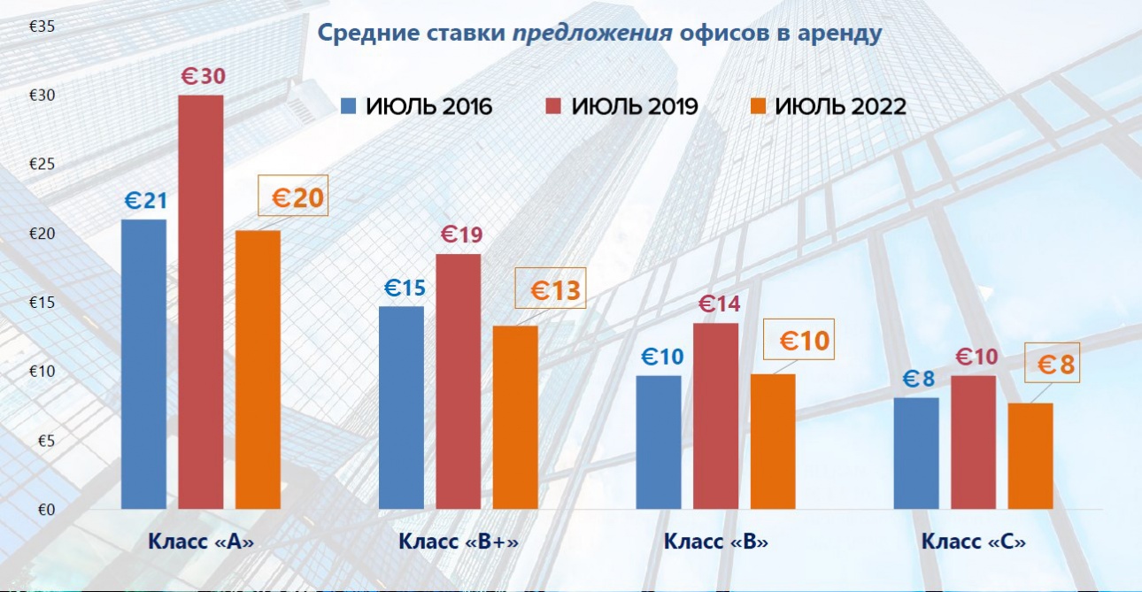 Сегодня, говорит эксперт, в ситуации профицита предложения рынок в первую очередь смотрит на цену, а потом уже на комфорт, именно поэтому в бизнес-центрах класса В+ и А офисы вынуждены очень сильно терять в изначально заложенных нормах доходности. Еще в I квартале 2022-го минимум шесть бизнес-центров класса А в Минске находили новых арендаторов в офисы со ставкой более 20 евро за квадрат. Сегодня таких цен нет даже в предложениях — не то что в реальных сделках.