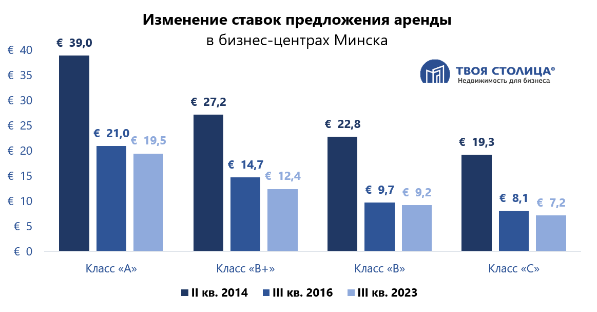 Еще совсем недавно на офисы класса В+ формировалась очередь из желающих арендовать, а ставки аренды на А-класс превышали 30 евро. Сегодня реальность гораздо суровее и прозаичнее: ставки пытаются пробить дно и к тому же формируются в белорусских рублях, а престижные офисы ищут арендаторов годами. Мы проанализировали, как изменились ставки за 2023 год и сравнили их с теми, которые были на рынке в течение десяти лет.
