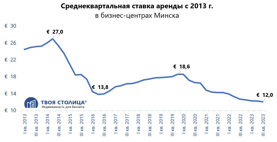 Пик стоимости аренды пришелся на весну 2014 года. Тогда средняя ставка предложения аренды находилась на уровне 27 EUR/кв. м. Средний показатель был на столь высоком уровне как из-за ставок по классу А, которые составляли порядка 38−39 EUR/кв. м. с НДС, так и из-за ставок по С классу, которые для нынешнего рынка офисов просто немыслимы — 17−18 EUR/кв. м. с НДС.