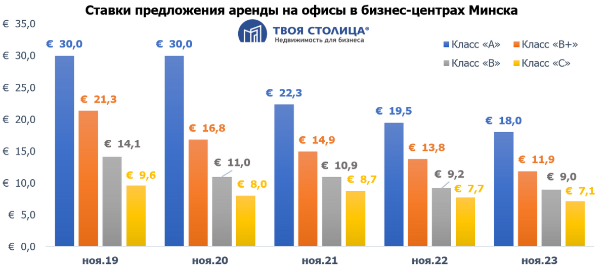 Рост объемов предложения качественных объектов привели к тому, что давление на стоимость аренды увеличилось, поэтому собственники были вынуждены ее снижать чтобы избежать упущенной выгоды от простоя помещения. Таким образом, сейчас на рынке офисной недвижимости можно наблюдать сохраняющееся снижение ставок аренды по всем классам качества. Только за 2023 средний уровень ставок предложения снизился на 5%, а по сравнению с концом 2019 – на 39%.