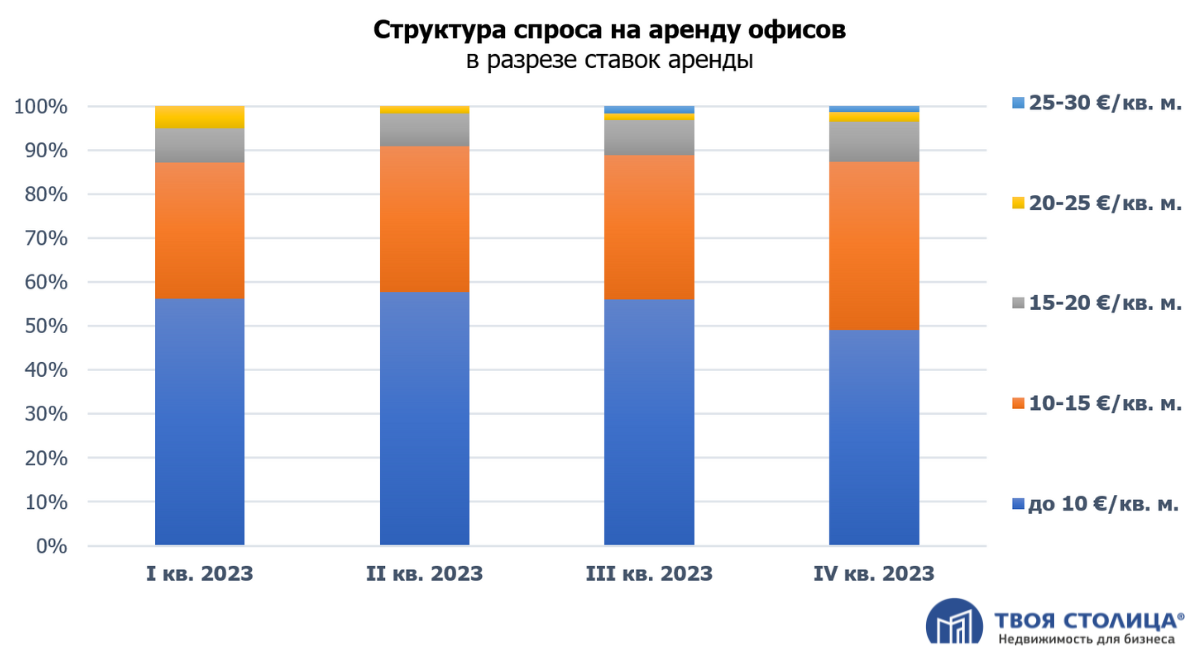 Причем эти офисы интересны арендаторам по ставкам до 10 €/кв. м, на них в 2023 приходилась доля 50-58%.