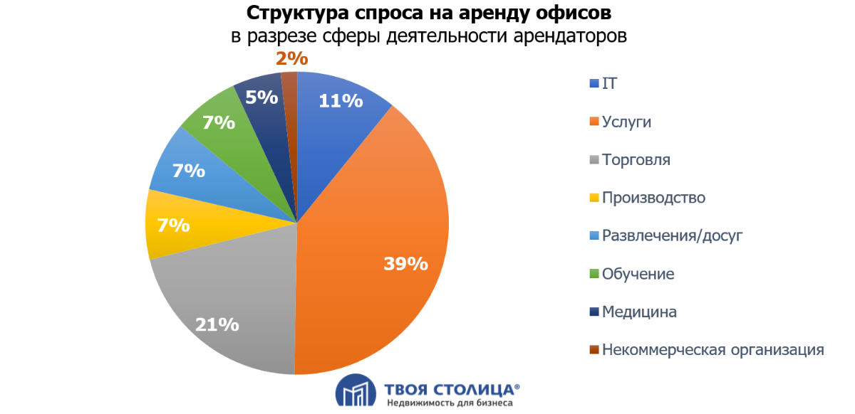 Основная доля в 2023 пришлась на компании сферы услуг и торговли – 60%, а вот на айтишников – 11% (в лучшие периоды 2019 – это было 40% от общего объема рынка).