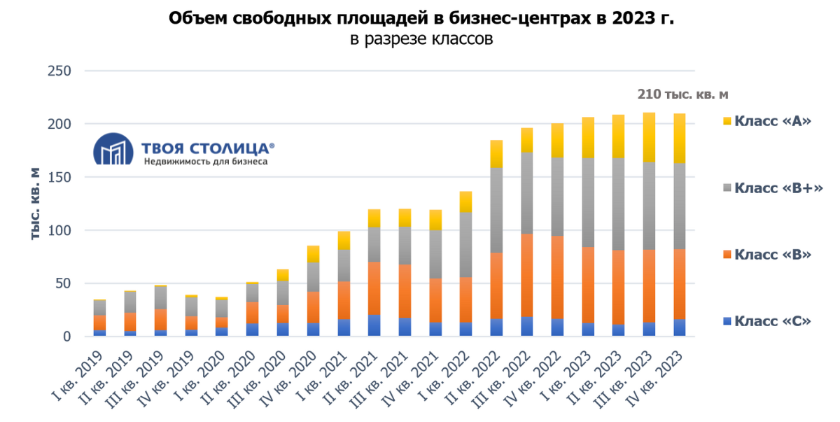 2023 год для рынка аренды офисов был достаточно стабильным годом, о чем говорит сохранявшийся на протяжении всего года уровень вакантности – порядка 18%, а объем свободных площадей на конец года составил 210 тыс. кв. м, его рост в течении года составил всего 2%.