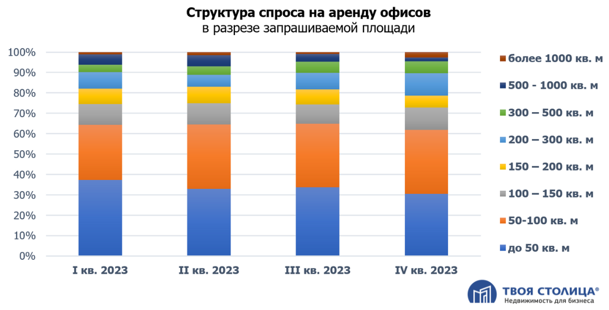 На протяжении всего года, основной спрос пришелся на площади до 100 кв. м – в пределах 60-65%