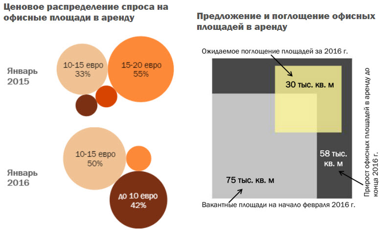 В начале 2016 в Минске было 75 тыс. м2 пустующих офисных площадей. До конца года ожидается пополнение рынка еще 78 тыс. м2. Из них 58 тыс. м2 – построены для последующей сдачи в аренду. При этом объем поглощения арендных площадей за этот год ожидается на уровне 25-30 тыс. м2 (на 30% меньше объема поглощения в 2015). Поэтому вакантность офисов в 2016 не снизится. Скорее, наоборот. Такой неутешительный прогноз основан на двух факторах: