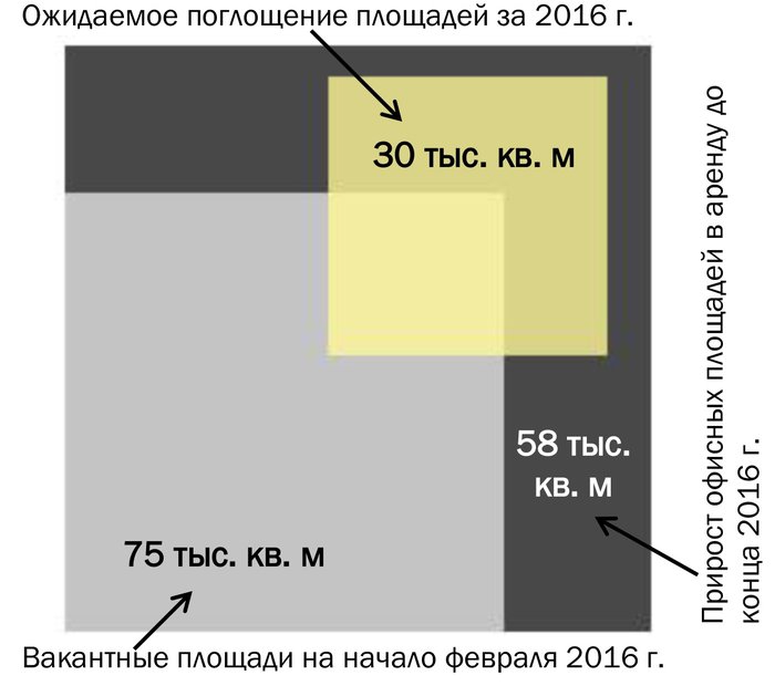 Объем вакантных офисных площадей в бизнес-центрах, предлагаемых в аренду по состоянию на начало марта оценивается в 75 тыс. кв.м. С учетом ожидаемого прироста рынка до конца 2016 года и того факта, что увеличение спроса на офисные площади не ожидается, то к концу года объем пустующих площадей может вырасти до 100 тыс. кв.м.