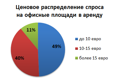 Сегодня половина всех потенциальных арендаторов рассчитывают снять офис до €10 кв. м с НДС, еще 40% — не дороже €15 кв. м с НДС и лишь 11% — ориентированы на ставку выше €15 за кв. м с НДС.