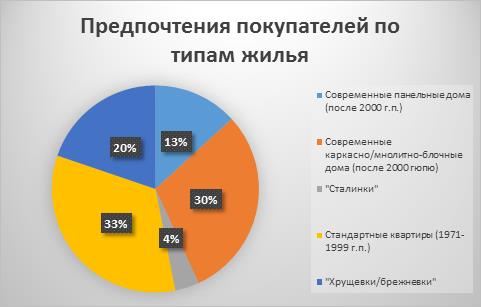 · Квартиры в старом жилом фонде хрущевско-брежневской эпохи предпочли 20% покупателей. Компактные квартиры выигрывают на рынке за счет небольшой цены за квартиру. Именно поэтому в этом сегменте наиболее популярны однокомнатные и двухкомнатные квартиры.