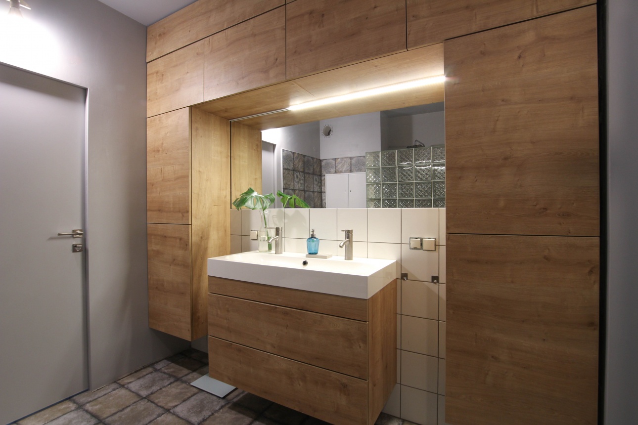 В ванной комнате просторная душевая, большая раковина на два смесителя, подвесной унитаз и нетипичный оригинальный и вместительный шкаф. Сантехника немецких брендовых производителей.