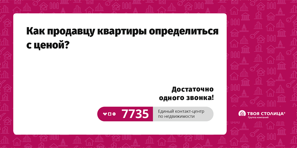 Сколько стоит моя квартира? – самый популярный вопрос среди продавцов столичного жилья. Порядка 90% продавцов, изучив аналогичные предложения на рекламных площадках, в итоге обращаются в агентство недвижимости. Обращение в «Единый контакт-центр по недвижимости» группы компаний «ТВОЯ СТОЛИЦА» по номеру 7735 поможет получить правильный ответ на этот самый популярный вопрос.