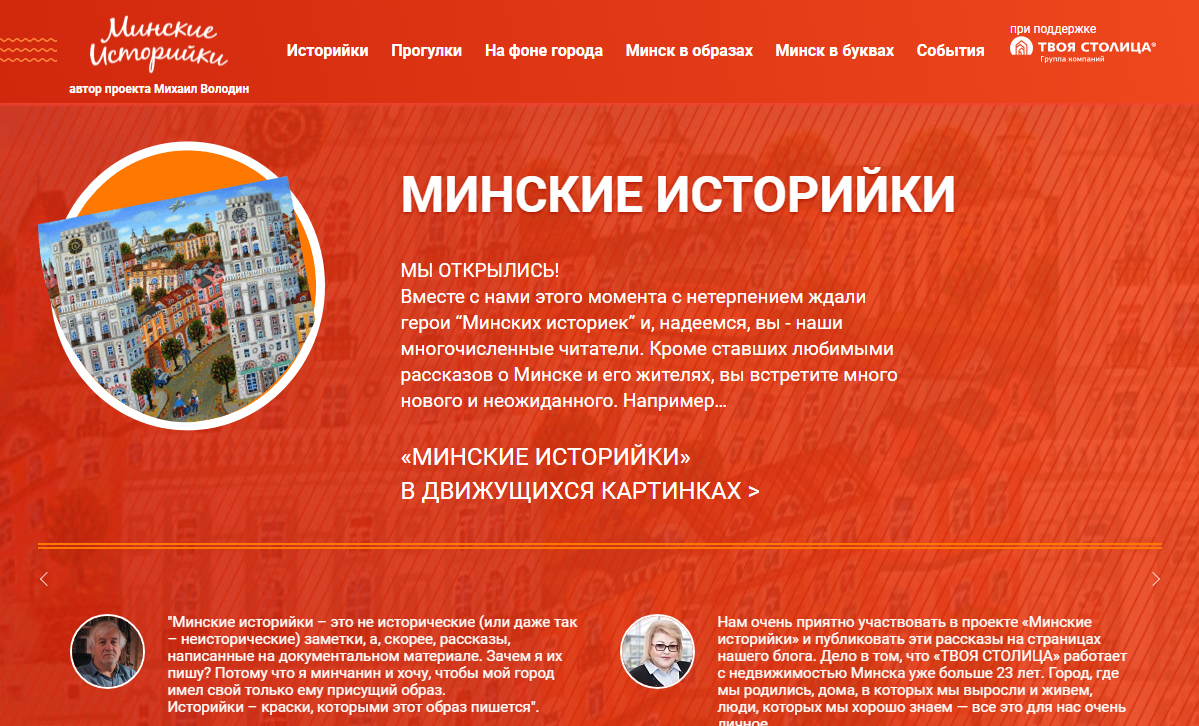 Мультфильм по «историйкам», новые рубрики, обновленный дизайн и множество приятных сюрпризов – вот он, настоящий подарок для всех, кто с нетерпением ждал продолжения проекта! При поддержке агентства недвижимости «Твоя столица» интернет-проект Михаила Володина «Минские историйки» получил новый сайт – новое место жительства.