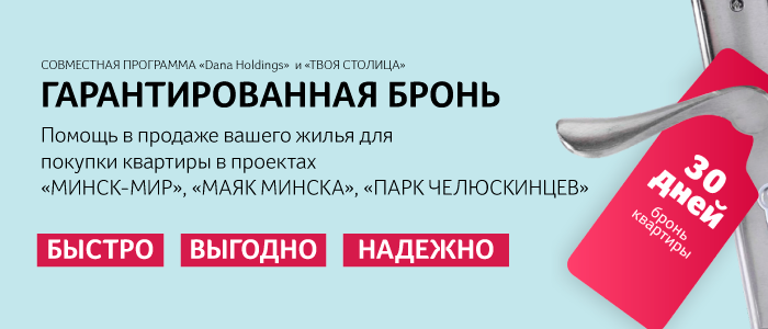 Выбирайте квартиру в проектах "МИНСК-МИР", "МАЯК МИНСКА", "ПАРК ЧЕЛЮСКИНЦЕВ", а мы забронируем ее для вас на 30 дней, без изменения стоимости при заключении договора на продажу имеющегося жилья в «ТВОЯ СТОЛИЦА.АГЕНТСТВО НЕДВИЖИМОСТИ»