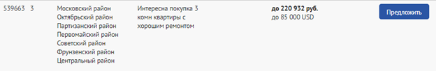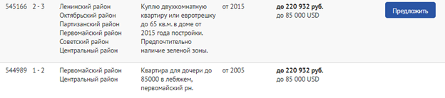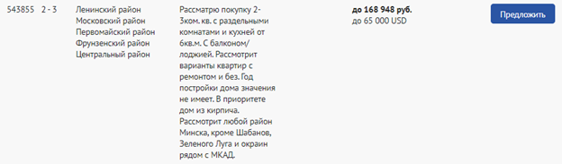 Воспользуйтесь удобным фильтром, укажите количество комнат, площадь, год постройки, материал стен, желаемую цену и прочее. Вы получите пул реальных запросов и можете сразу же предложить свою квартиру потенциальным покупателям. О Вашем предложении сразу же узнает клиент, который в нем заинтересован. Благодаря сервису «Декларированный спрос», большинство собственников находят своего покупателя в кратчайшие сроки. Предложите вашу недвижимость покупателям прямо сейчас!