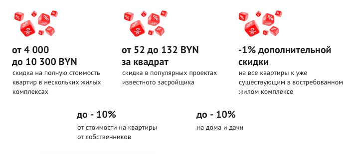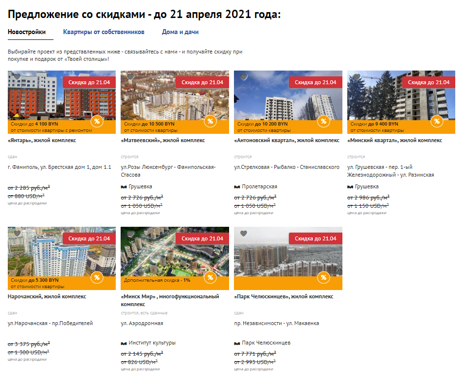 - в представленных жилых комплексах есть ряд квартир со скидкой. Максимальный размер - 10300 BYN. Вы можете выбрать квартиру в следующих проектах: