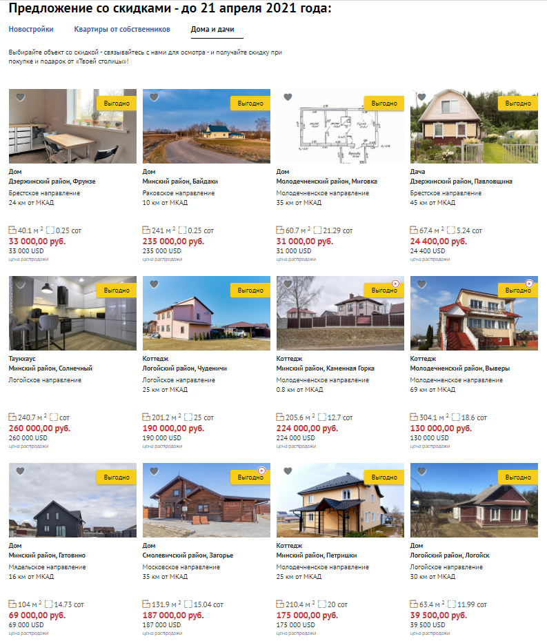 - в карточках квартир и домов указана цена до и со скидкой. Дисконт стартует от 2 600 BYN.