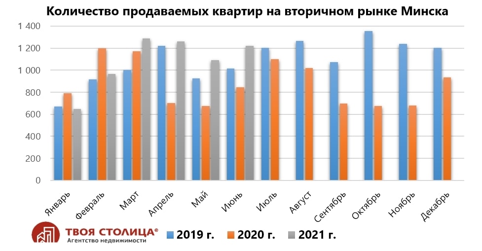 — Чтобы цифры были наглядней, предлагаю сравнить первое полугодие 2019, 2020 и 2021 годов. Почему заглядываем так далеко? Потому что 2019 год был стабильным, в отличие от пандемийного 2020-го. Так вот, даже не взирая на всю стабильность, 2019-й проиграл 2021-му по количеству совершенных сделок. За первые 6 месяцев 2019 года в Минске было совершено примерно 5800 сделок, за тот же период 2020-го — 5400, а в этом году с января по июнь в столице продано около 6500 квартир.