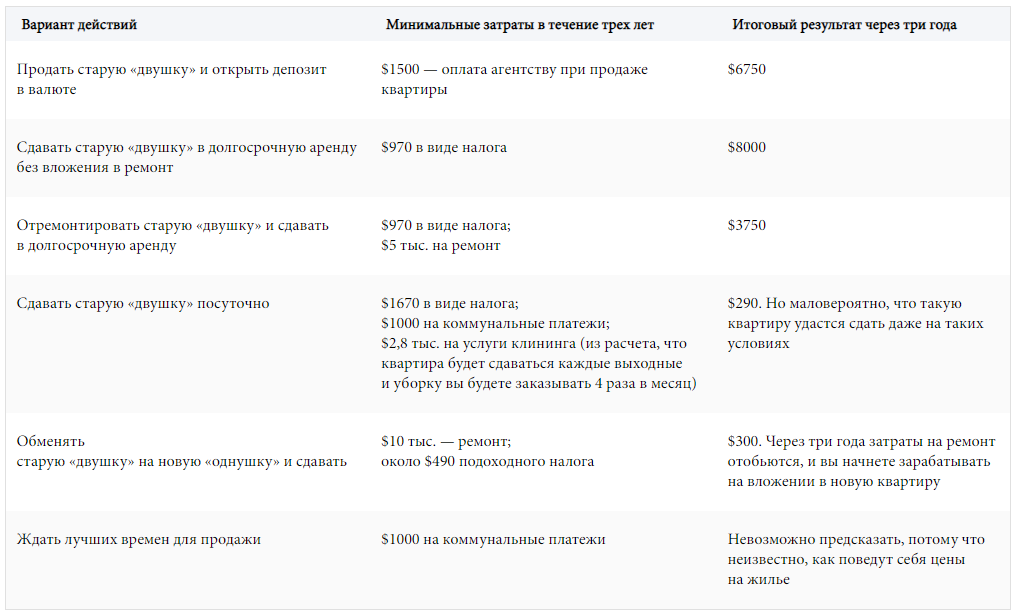 Попробовали примерно подсчитать, какую выгоду с учетом всех расходов даст каждый из выбранных вариантов через три года. Сразу уточним, что расчет примерный: он будет актуален при условии неизменного курса доллара и налоговых ставок. Также нужно иметь в виду, что все варианты рассчитаны для идеальных условий. Например, в случае с продажей вы находите покупателя с лучшей ценой, если сдаете — то в течение всего срока по максимально возможным тарифам. Не учитывали и форс-мажорные обстоятельства вроде расходов на непредвиденный ремонт.