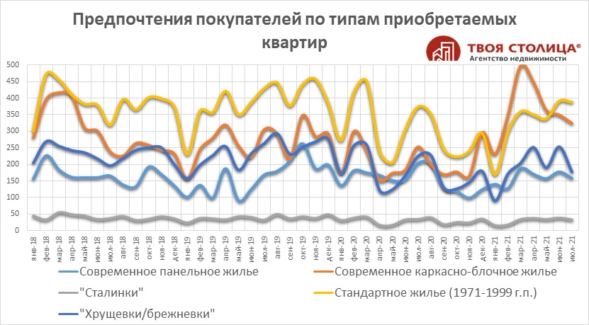 Чаще всего покупатели приобретают квартиры в домах, построенные с 1971 по 1999 год. В июле таких сделок было 36%. Это средний ценовой сегмент на вторичном рынке жилья, доступный большинству покупателей.