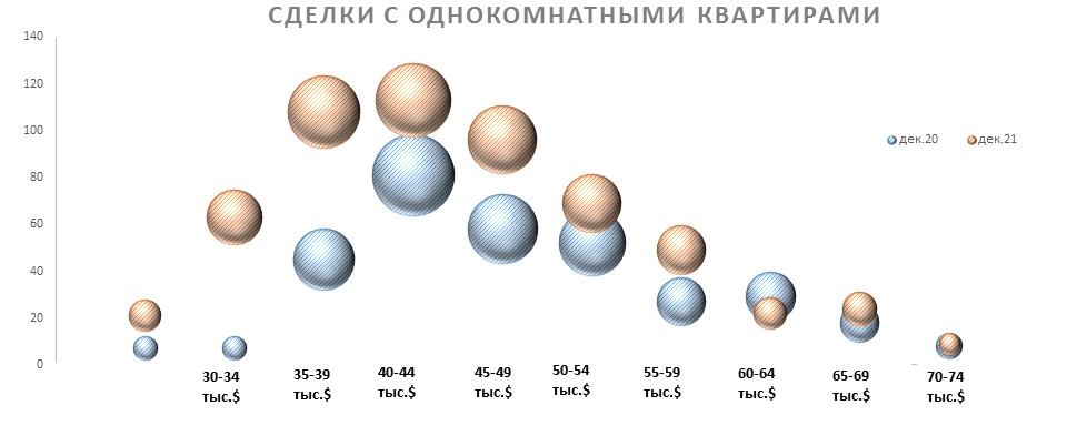 В декабре 2020 г. более востребованы были «однушки» в ценовом диапазоне от 40 до 55 тысяч USD. С такими квартирами было заключено более 55% всех сделок. В декабре 2021 г. чаще всего покупали квартиры стоимостью 35-45 тысяч USD, а доля однокомнатных стоимостью 50-55 тысяч в общем количестве сделок значительно снизилась.