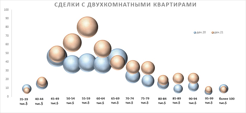 Подобное снижение цен сделок отмечается и в сегменте двухкомнатных квартир. Самый популярный ценовой диапазон снизился на 5 тысяч USD. В конце 2021 года больше всего сделок с «двушками» заключалось по цене от 45 до 60 тысяч USD.