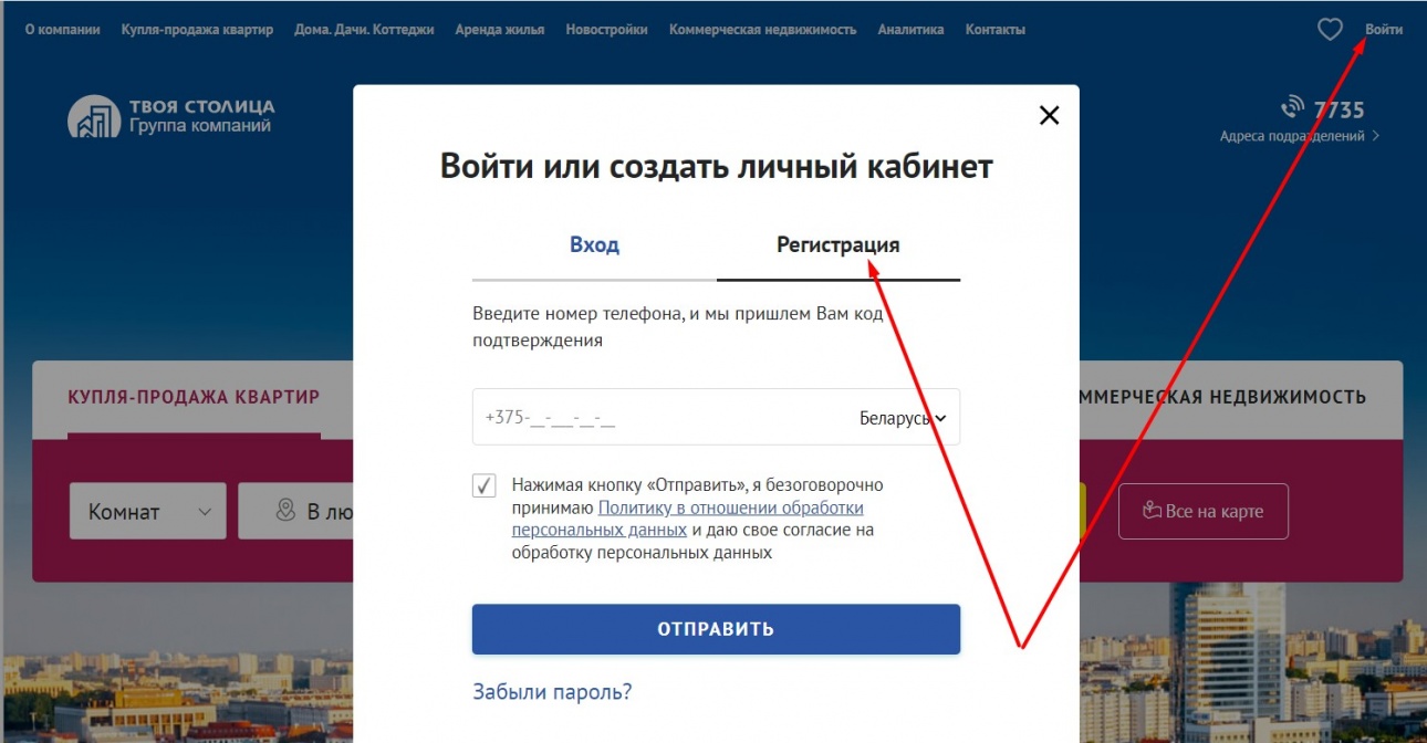 Если Вы ранее не регистрировали личный кабинет на сайте t-s.by, пройдите процедуру регистрации. Для этого нажмите кнопку Войти и перейдите на вкладку Регистрация.