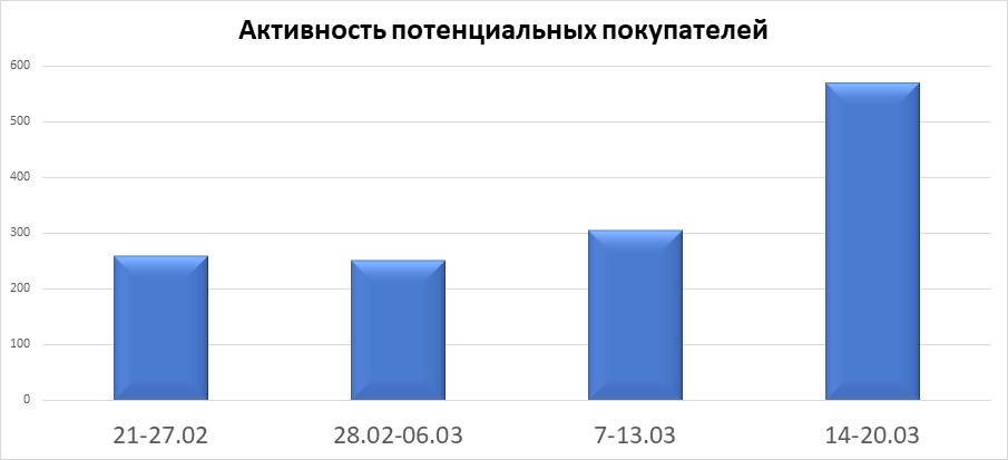 Пожалуй, первую психологическую стадию шока рынок уже пережил и начал постепенно подстраиваться под изменившиеся условия. Глубину потрясение на рынке всегда можно оценить по активности покупателей. Если в начале периода нестабильности уровень покупательской активности снизился до минимальных значений, то 21-27 марта прослеживается его рост с одновременным трендом на изменение интереса покупателей.