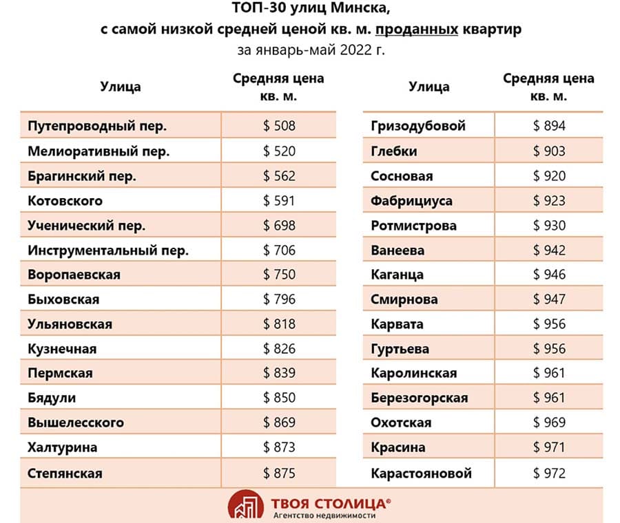 От дорогих и красивых квартир перейдем к тем, что находятся на другом полюсе столицы. По данным НКА и «Твоей столицы», самые дешевые локации — это Путепроводный, Мелиоративный и Брагинский переулки. Затем идут улица Котовского и Ученический переулок. В этих местах даже можно найти заветный метр «по пятьсот».