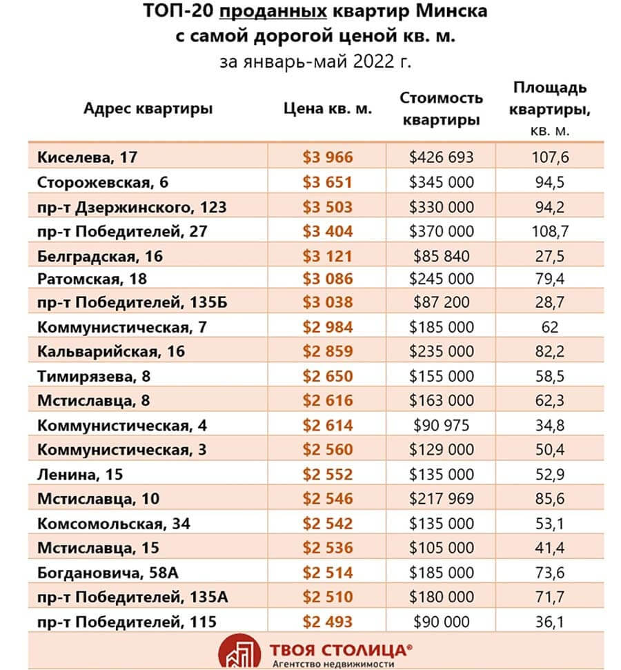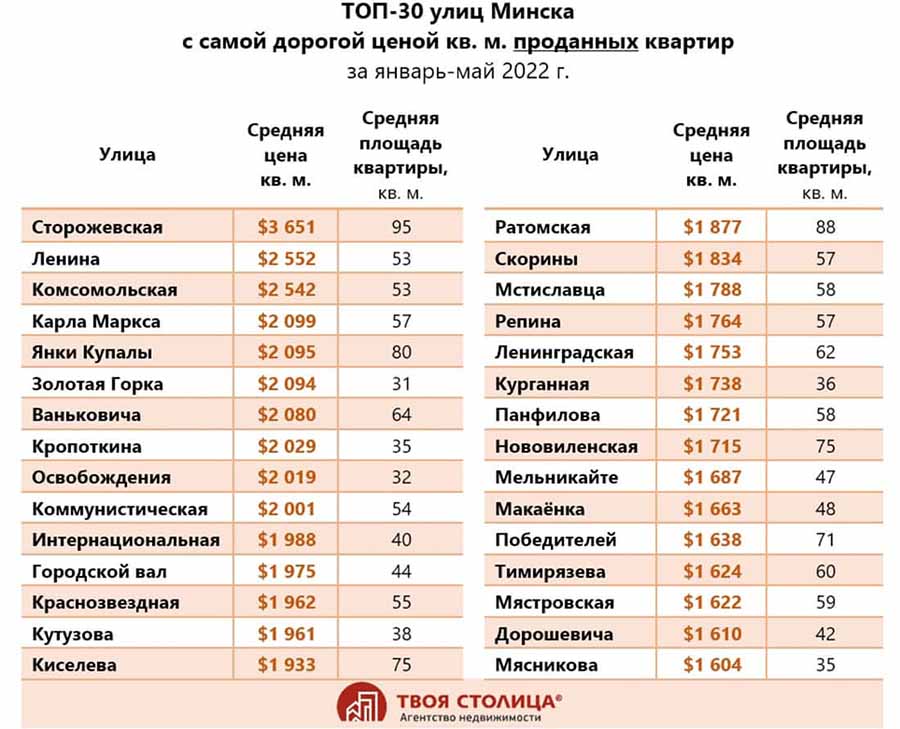 Но вернемся к дорогим минским улицам и посмотрим, сохранилось ли за Пионерскими да Тепличными былое лидерство. Уточним, что данные брались из базы Национального кадастрового агентства, зафиксированы были сделки, совершенные с начала года и до конца мая. При этом надо понимать, что продажи объектов с «суперценой» не такое уж и частое явление (все-таки не однушка в «спальнике»), поэтому все достаточно относительно. Но тем не менее показательно.