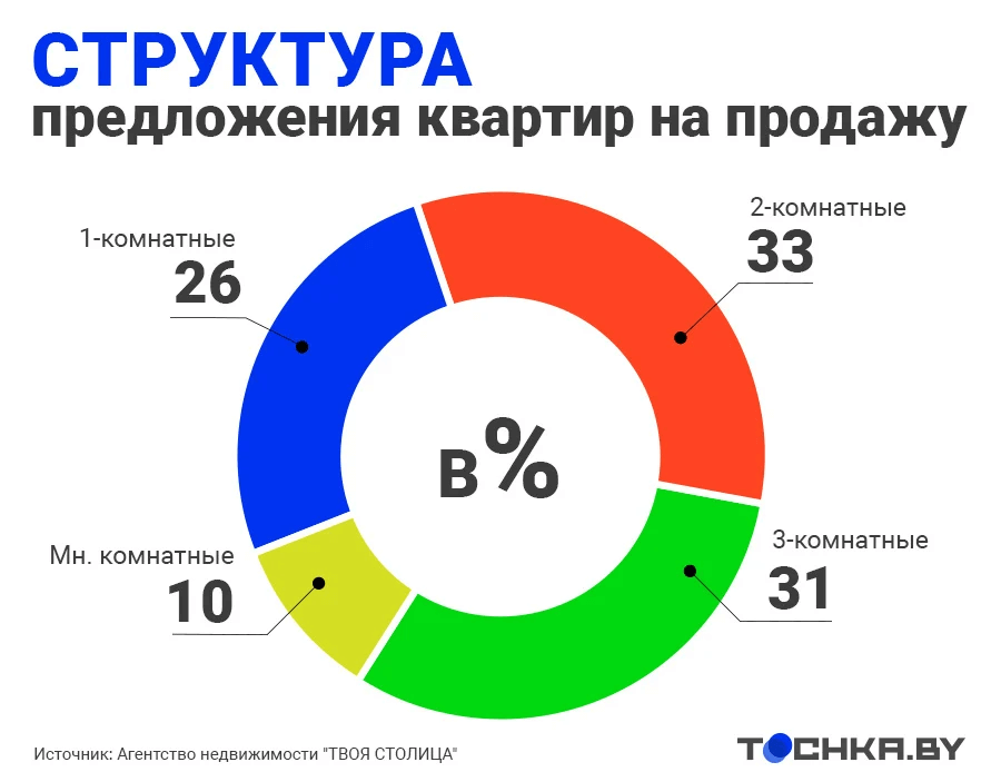 Больше всего среди них "двушек" – примерно треть от общего количества. Почти столько же "трешек" и 26% "однушек". Наименьшее количество многокомнатных квартир, где четыре и более комнат.