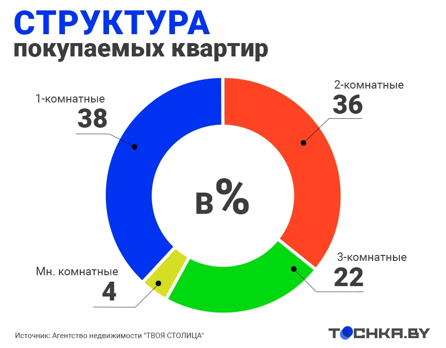 Покупают, по информации агентства "Твоя столица", чаще всего "однушки" и "двушки". Сделки с "трешками" на третьем месте (22%). Минимум сделок по многокомнатным (4%).