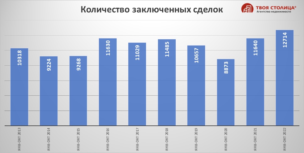 Всего за 10 месяцев текущего года заключили более 12700 сделок с квартирами – это абсолютный рекорд среди аналогичных периодов прошлых лет. Для сравнения, за 10 месяцев 2021 года продали 11640 квартир. Такая активность покупателей сдерживает рост предложения и позволяет ценам оставаться в достаточно равновесном положении.