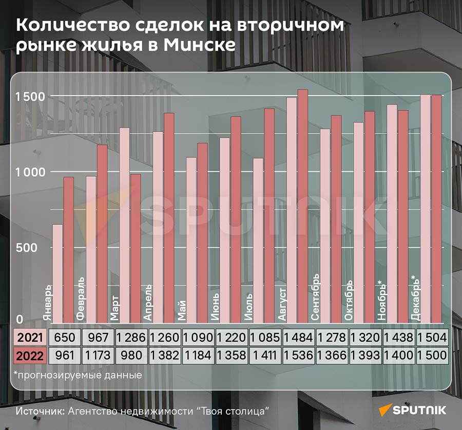 "Судя по темпам продаж квартир в первую неделю декабря, 2022 год станет новым рекордным. За январь-ноябрь прошлого года в Минске было заключено 13,1 тысячи сделок, а за аналогичный период 2022-го уже 14,1 тысячи", – объясняет эксперт.