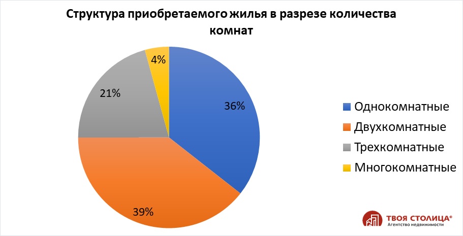 Чаще всего в апреле приобретали двухкомнатные квартиры – их доля в объеме продаж составила 39%. Доля однокомнатных – 36%.