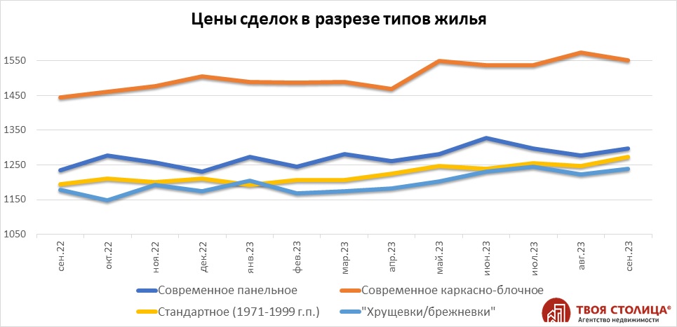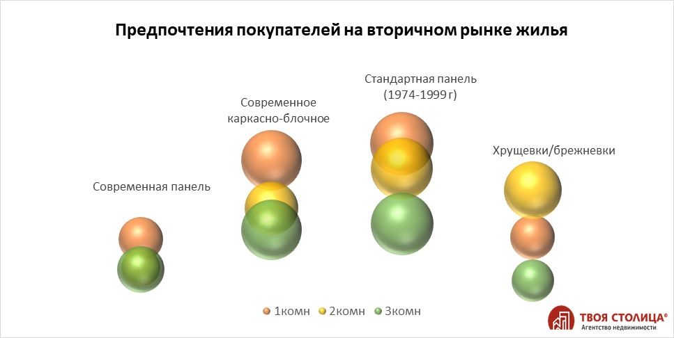Если не учитывать квартиры-новостройки от застройщиков, на вторичном рынке жилья в сентябре лидировали однокомнатные и двухкомнатные квартиры в стандартных панельных домах, построенных до 2000 года. Им немного уступали однушки и двушки в современных каркасно-блочных домах. В хрущевках/брежневках наиболее востребованы были однокомнатные квартиры.