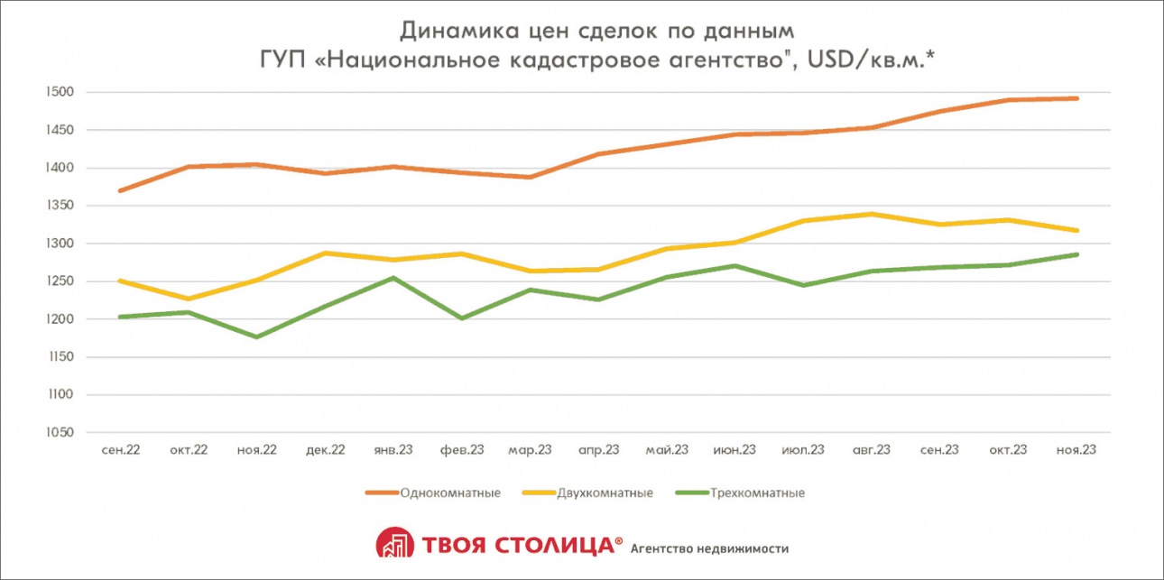 На первичном рынке цены на квартиры в 2023 году выросли, в среднем, на те же 6%. Средняя стоимость квадратного метра в новостройках города по итогам ноября составила 1353 доллара. Для сравнения — исторический максимум был отмечен в ноябре 2014 года и составлял 1719 долларов.