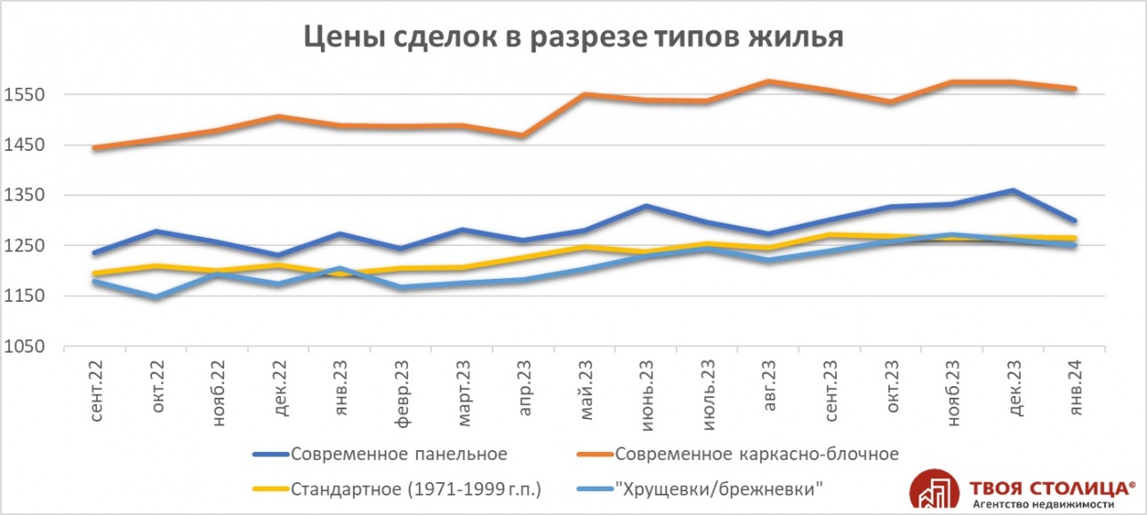 В январе средние цены сделок с квартирами не изменились и остались на декабрьском уровне. Как правило, самые дорогие сделки заключаются с квартирами в современных каркасно-блочных домах. Такие квартиры отличаются высококачественным ремонтом и современной встроенной техникой.