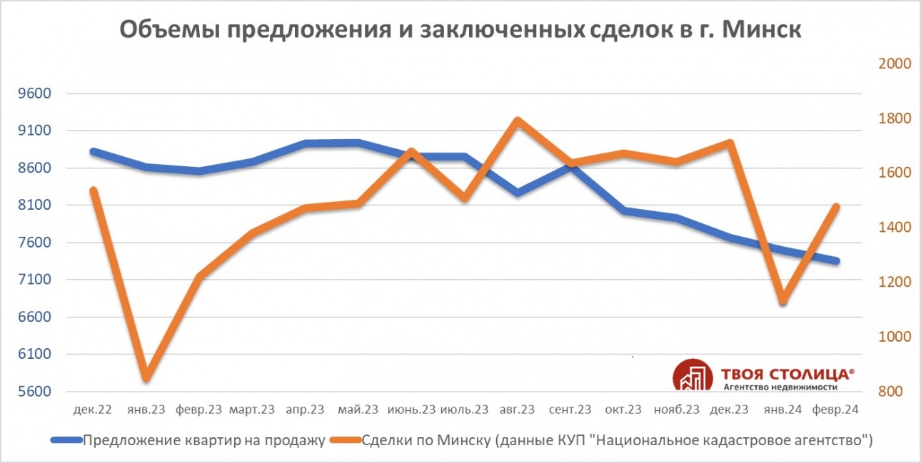 В результате, на рынке продолжает снижаться объем предложения. Без учета новостроек от застройщиков, сейчас в Минске на продажу выставлено 7350 квартир. Очевидно, что в период активности с рынка вымываются квартиры, наиболее адекватные по соотношению цена/качество и, как следствие, предложение постепенно дорожает.
