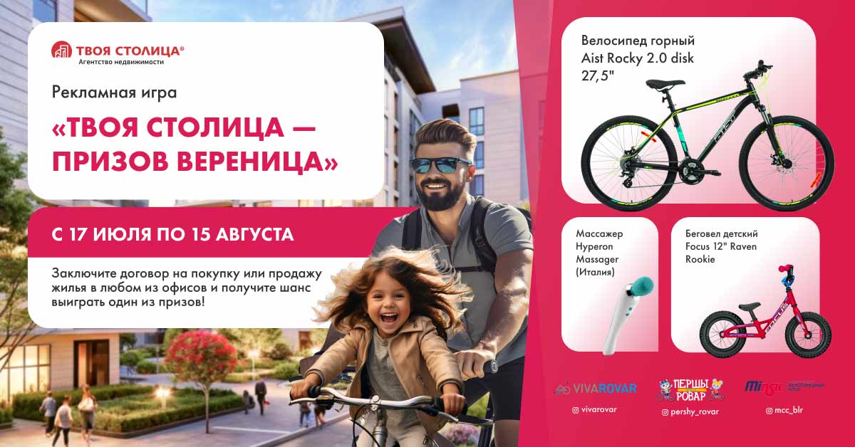 “Твоя столица - призов вереница” - рекламная игра для клиентов агентства недвижимости “Твоя столица”, которая пройдет в июле-августе 2024 года! Участником новой игры стать просто - необходимо с 17 июля по 15 августа 2024 года заключить договор на услуги по покупке или продаже жилья. Каждый из клиентов компании получит шанс выиграть один из суперпризов! Партнёры - Велосипедный клуб “Минск”, детско-юношеский спортивный проект “Першы ровар” и сеть веломагазинов VIVAROVAR.