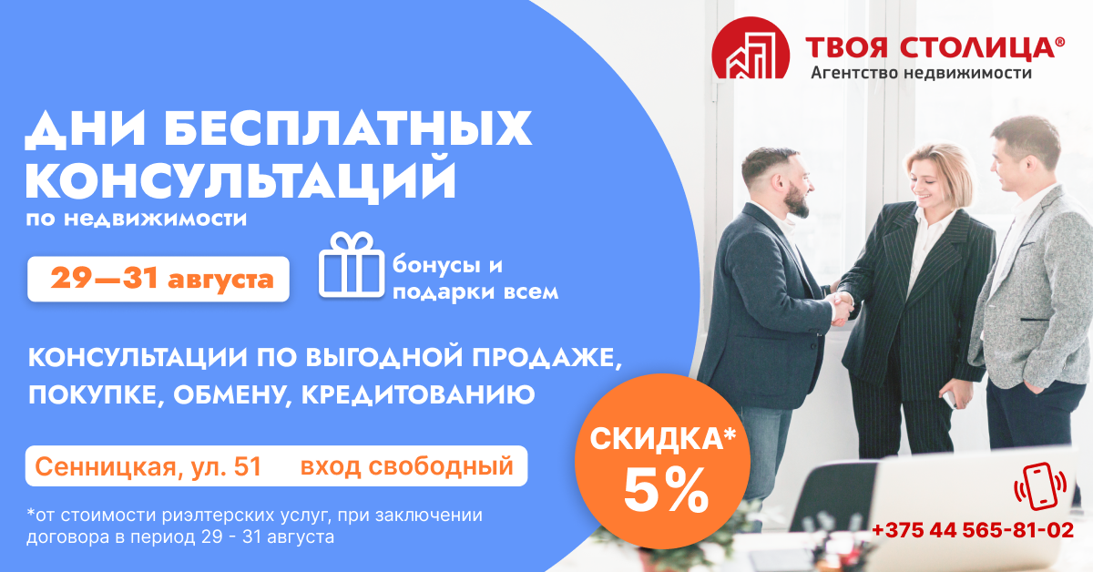 С 29 по 31 августа в офисе “Метро Аэродромная” агентства недвижимости “Твоя столица” по адресу ул. Сенницкая, 51 пройдут дни открытых дверей. В эти даты будут проходить бесплатные расширенные консультации экспертов по недвижимости для тех, кто хочет продать, обменять или купить жилье в Минске.