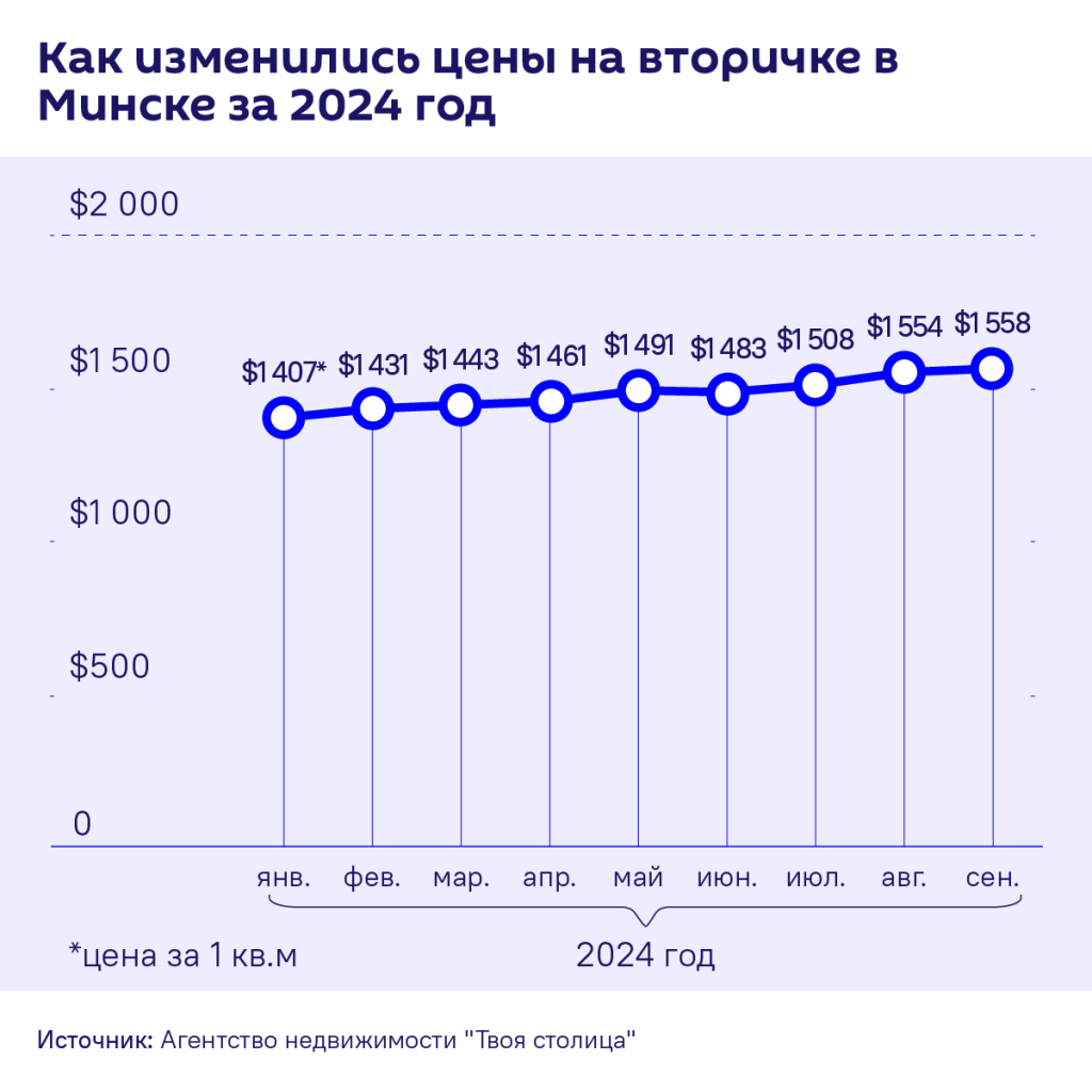 Для сравнения: минимальный средний ценник за "квадрат" жилья в белорусской столице был зафиксирован в апреле 2016 года – 1080 долларов. Тогда специалисты зарегистрировали так называемое "ценовое дно". Максимум же был в октябре 2013-го – 1730 долларов.