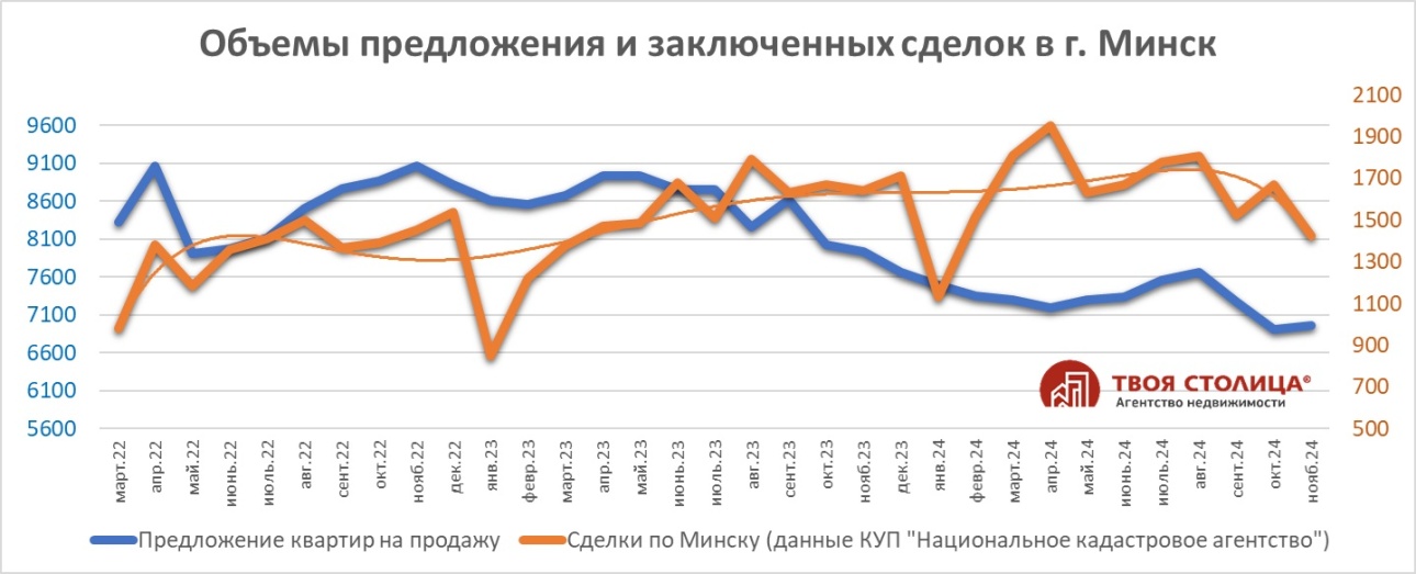 В ноябре активность покупателей резко просела. За месяц было заключено порядка 1450 сделок, из них 5% с новостройками от застройщиков. В 2024 г, не считая января, это минимальный уровень зарегистрированного спроса на вторичном рынке жилья.