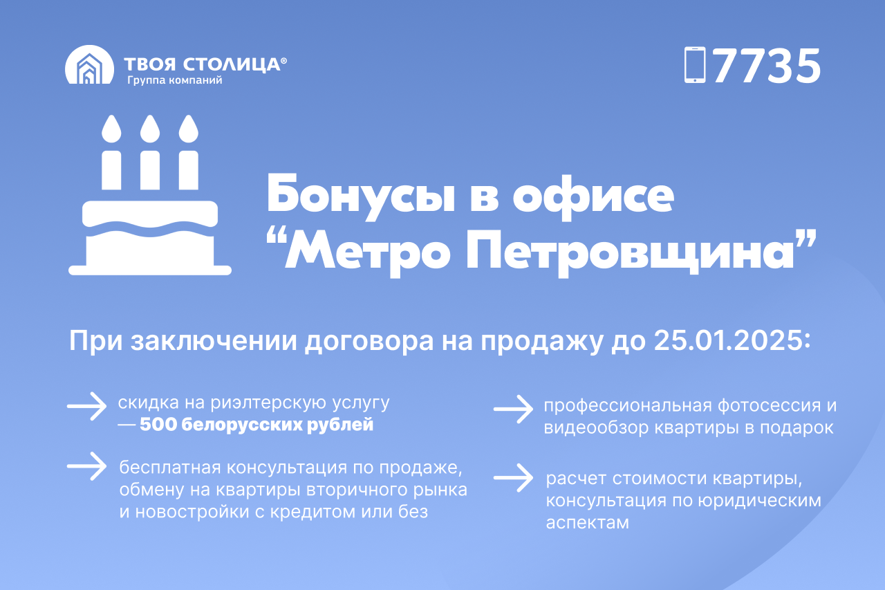 Каждый, кто придет на бесплатную консультацию по недвижимости в офис “Твоей столицы” “Метро Петровщина” до 25 января 2025 года получит электронный сертификат на 500 белорусских рублей на риэлтерскую услугу по продаже объекта недвижимости, которым он сможет воспользоваться в течение всего 2025 года либо подарить родным и знакомым.