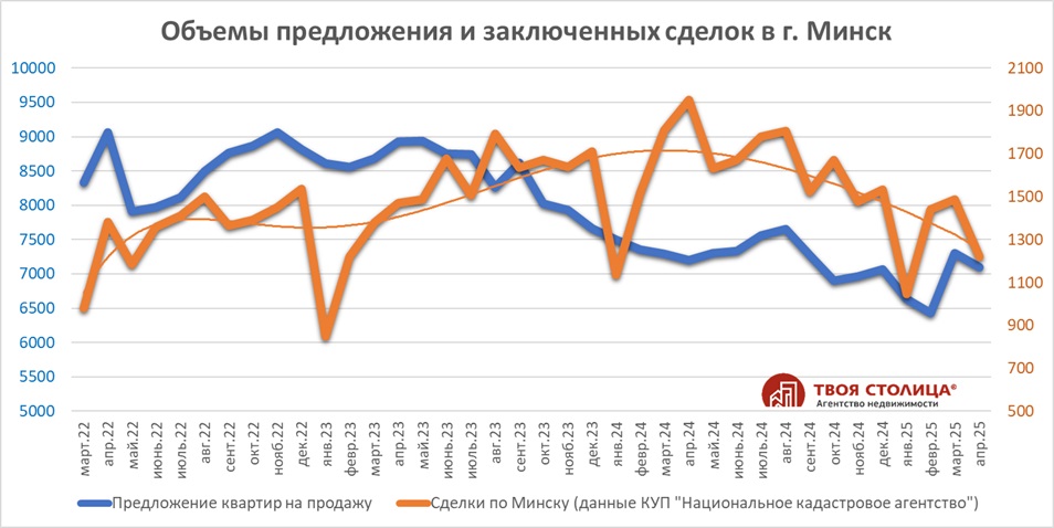 Апрель для рынка жилой недвижимости Минска стал месяцем резкого замедления. Всего было зарегистрировано 1252 сделки купли-продажи квартир — без учёта долей и комнат. Это один из самых низких показателей за последние месяцы. Такие показатели достаточно отчетливо говорят о приближающемся периоде “стабильного рынка” и были характерны для периода 2017-2019 гг.